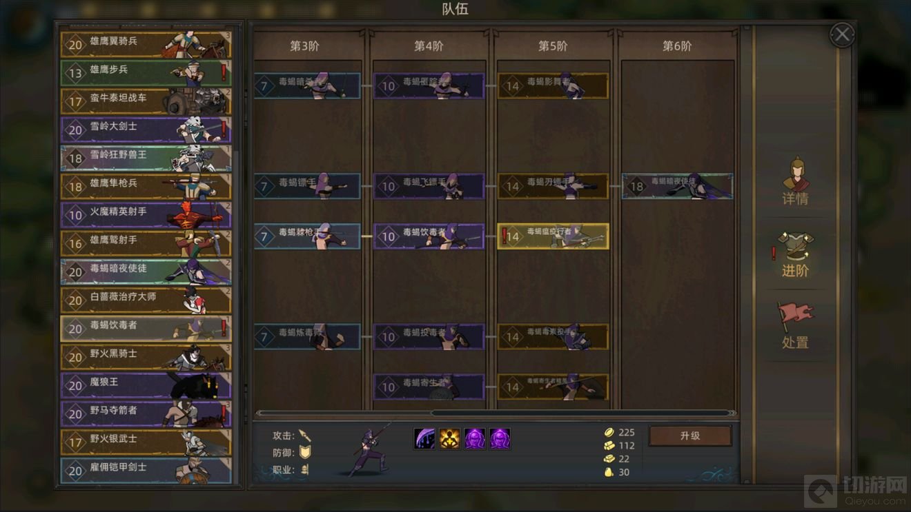 玩家可以选择让自己的部队进化成更高阶的兵种。兵种最高有六阶,每进化一次需要消耗不等的金币、铁石、木材甚至是稀有的玉石等。但每个部落的士兵都有且仅有一种独特的六阶最强兵种。所以当决定要训练这些士兵时要事先确定好他们的强化路线,以免因选择错误而蒙受损失。
