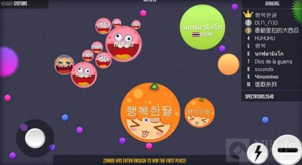 3. 可以把自己的名字改为含有炸弹样式的名字,这样的话,进去就是黑色的球体,不容易被辨认,还可以偷袭对手,也就是说我们尽量选择和背景色一样的球体颜色,这样隐藏在周围的环境中,很容易偷袭对手的;还可以隐藏在大球身体里面。