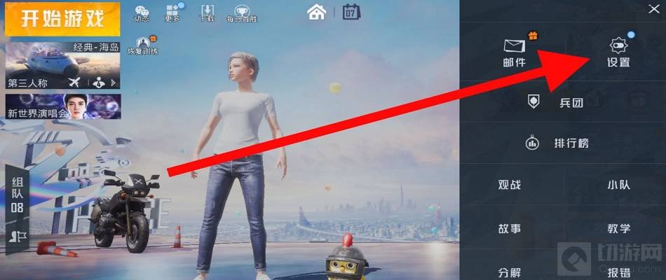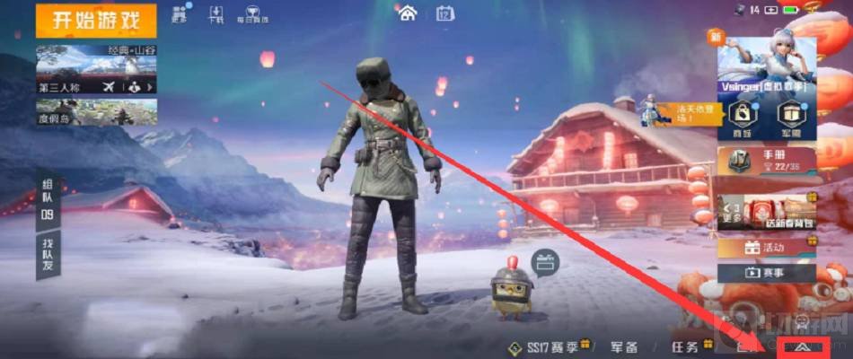 和平精英第三人称镜头视野怎么调?在游戏中有部分玩家的此还不太了解。接下来让为大家介绍一下吧。 和平精英第三人称镜头视野调法: 1.首先进入游戏,找到页面右下角箭头并点击。 2.然后点击右上角【设置】。