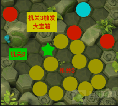 3、当你进入机关1机关2通道后,你会遇到花瓣石阵,根据黄线的路径可以破解花瓣石阵