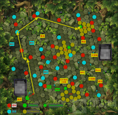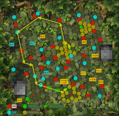 这幅图是NPC、资源、怪物与Boss的分布图,其中红色圆圈是怪物,蓝色圆圈是资源,绿色圆圈是可移动石头,这个石头是本图的关键,用来解锁三个石头阵,如图。