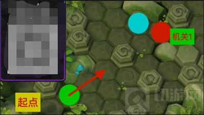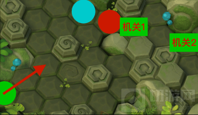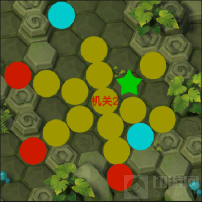 1、在起点位置,按照红线、黄线的路径,可以将石头推到机关1处的星星目的地,以便破解三角石阵,三角石阵破解后,会出现一个机关,我给的编号是机关1,用来破解通往最终Boss通道的机关1位置