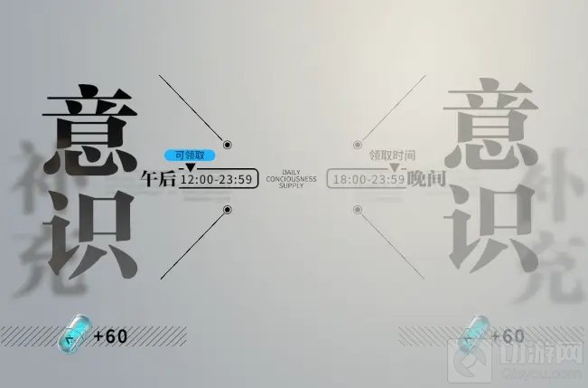 意识:即是绝大多数游戏中的体力,也是当下最重要的资源,每天中午和傍晚都可以领取60点,考虑到每个小伙伴的需求不同,所以领取的时间官方大大还是设置的很充裕的,不像有的游戏只能在当天某个特点的时间内才可以领取,但是一定要记得当天领取哦!