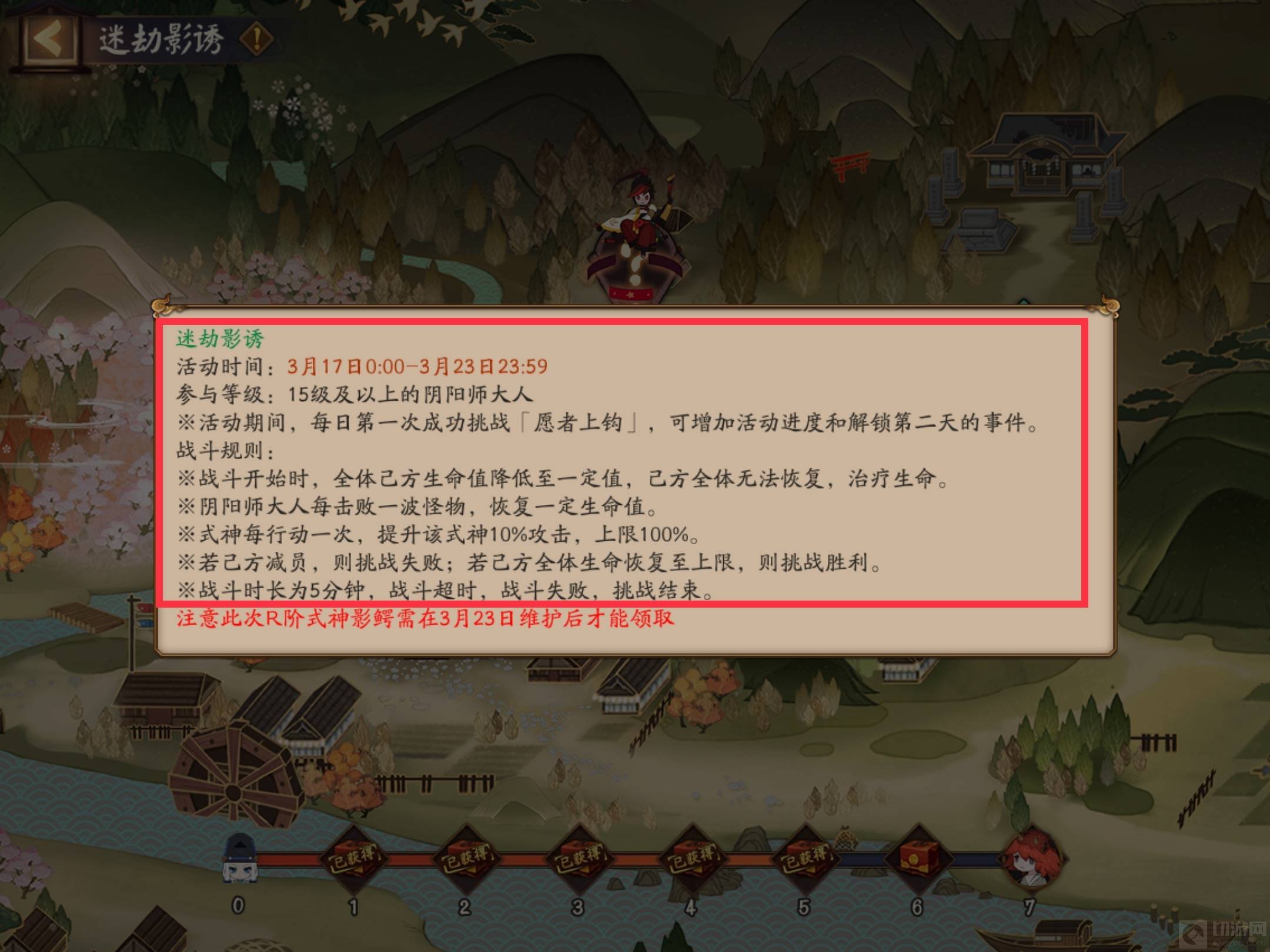 1、迷劫影诱是活动的时间是在3月17日到3月23日,一共有7天,每天玩家都可以挑战愿者上钩并获得一定的奖励。