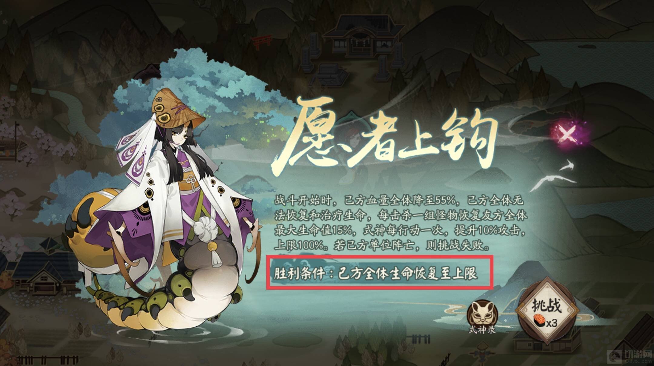 2、愿者上钩的胜利条件是,我方全体生命恢复至上限,开局时我方血量只有55%,每击杀一组怪物可以恢复我方部分血量。