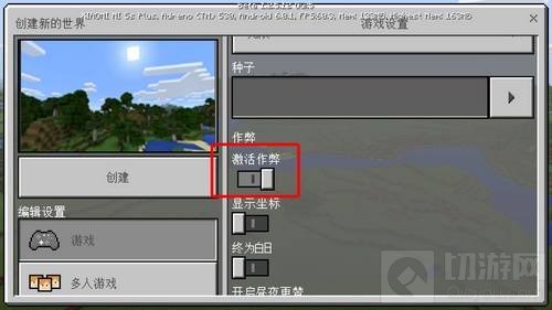 1,首先需要开启作弊功能,在创建新的世界的游戏设置中找到作弊相关选项,将激活作弊按钮开启,再点击创建游戏进入游戏。