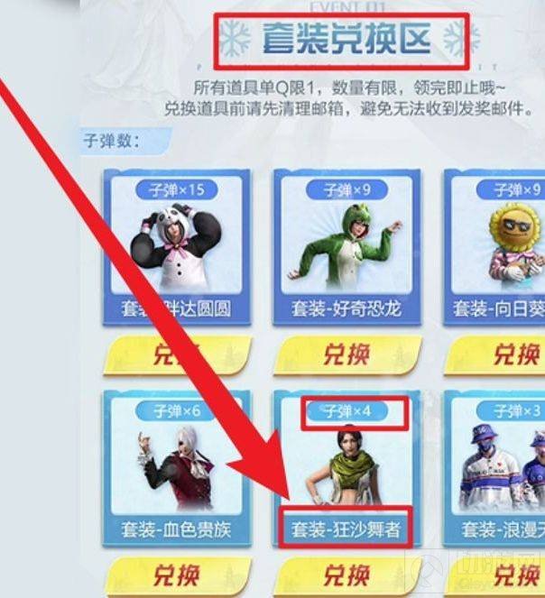 1、首先打开游戏,进入套装兑换区后直接用4个子弹就可以兑换狂沙舞者。