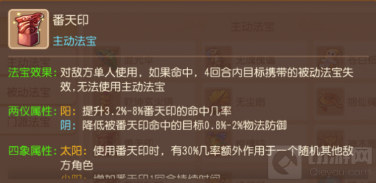 作为一件10级可达76%命中率的法宝,番天印的两仪属性当然要选择提升命中概率的阳仪,当番天印的三条阳仪属性都逆满之后,番天印的命中概率也就来到了100%。此时我们不仅不用担心番天印盖不中的问题,还能达成太阳四象,有30%概率额外作用于一个随机敌方单位,让番天印的压制效率大幅提升。