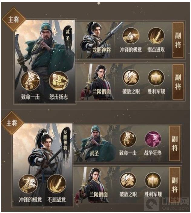 一、连击骑的阵容核心是武圣、龙胆神将、兰陵假面三个英雄,其中最为核心的以兰陵王的辅助技能为中心建立起的追击技能伤害加成,再加上龙胆与武圣构成兵种专精优势,是中前期非常强力的阵容。