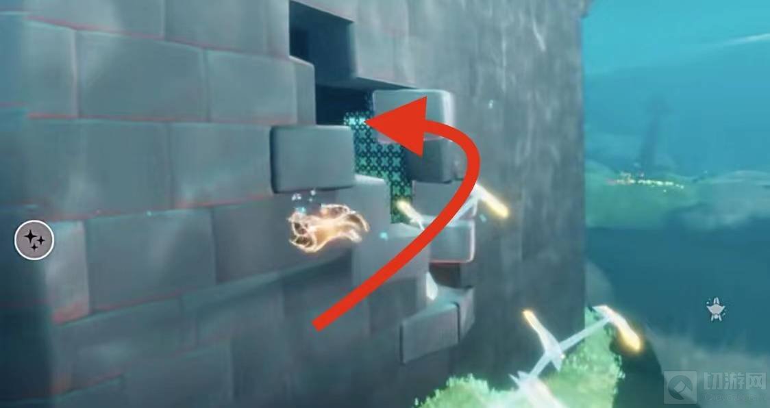 4、进入水中之后,可以看到一座小房子,点击自己的人物角色可以看到在小房子里面会有一个蓝色的星星光点。