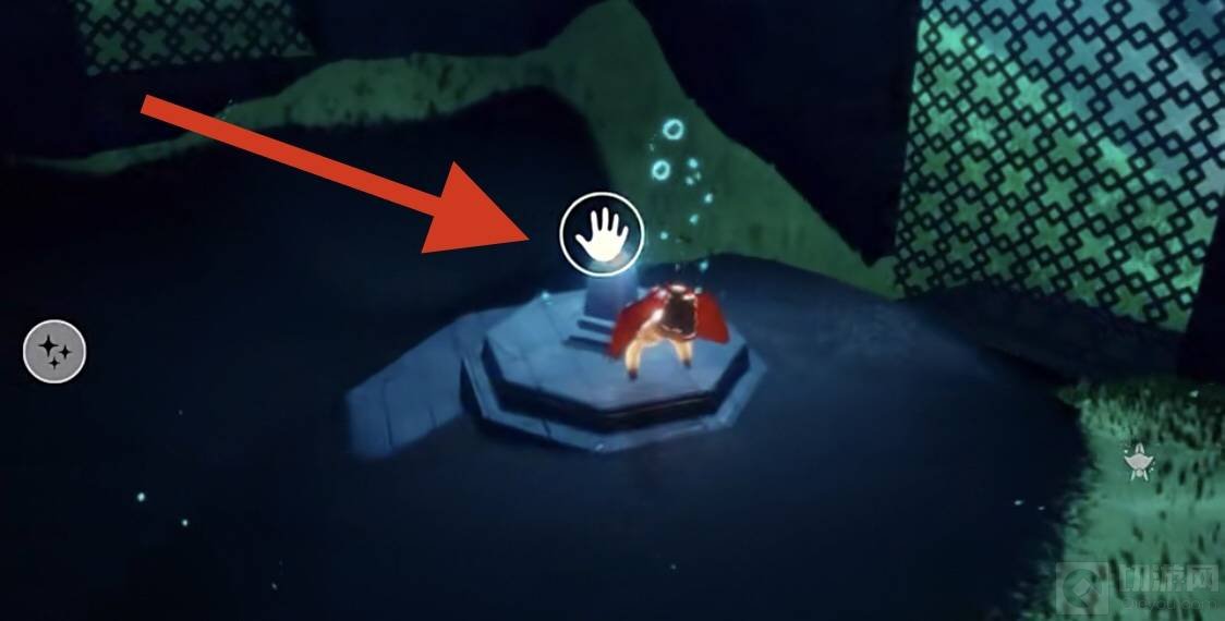 6、进入小房子之后,会看到一座机关,靠近之后会有手掌的标志,点击之后机关就会开启了。