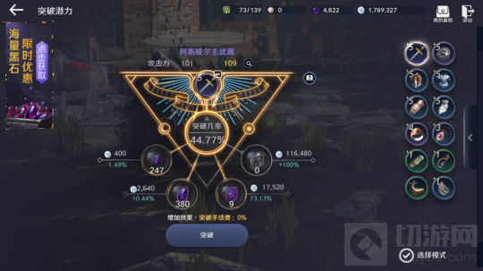 开启该功能后,玩家可以使用黑石道具来强化装备的能力值。使用的黑石越多,突破成功的几率越高。装备的品级与目前突破的阶段越高,黑石能增加的突破几率越低,也就需要累加更多的黑石。当突破失败时可以消耗银币或突破复原券来恢复部分数值,如果不恢复的话装备突破几率将被重置,也就是说黑石将被白白消耗。因此推荐玩家积攒黑石到自己预期的突破几率再进行突破,降低损失。