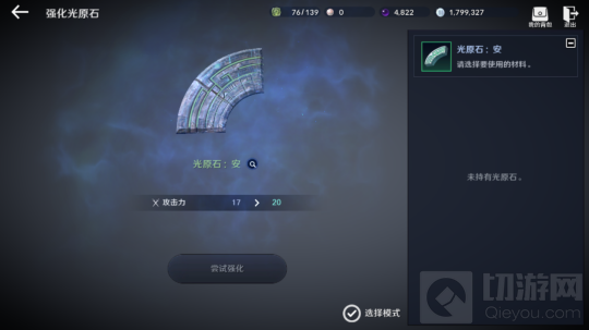 可选择同品质同部位的光原石为材料,进行强化。强化成功将增加攻击力、防御力;失败将消耗1耐久度,耐久度耗尽将无法再次强化。
