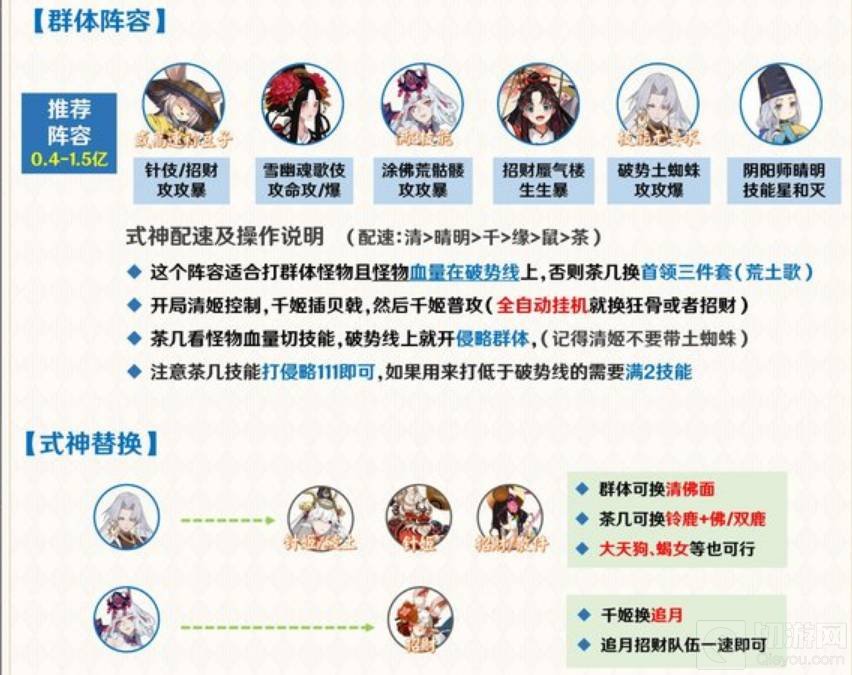 这两套阵容可以根据玩家手中所拥有的式神进行搭配战斗,里面详细介绍一些如何打怪的操作及配速搭配说明。