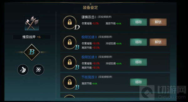 当我们装备改造达到四级以后,就可以花费一定的材料鉴定出两条关于技能加强的词条,六级以后可以再鉴定两条,八级以后再鉴定两条。当前装备可以鉴定出一共六条词条。