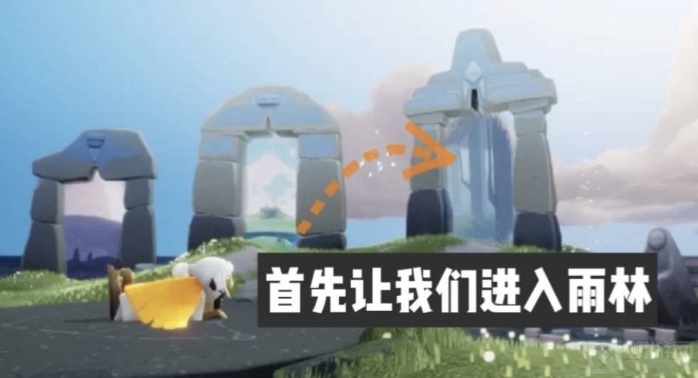 1、第一步先进入雨林地图,进入地图后一直向前飞,穿过云洞通过蜡烛开启石门到达雨林的终点大门前。