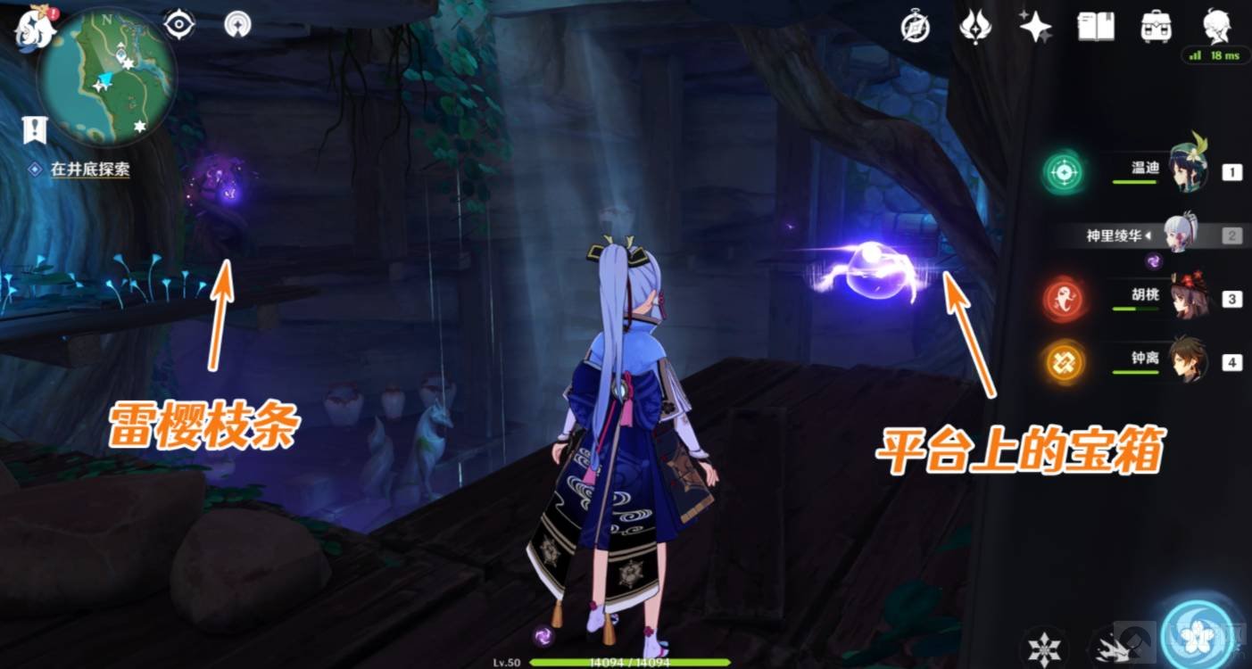 4.一路跟随触碰雷灵,继续向深处探索,洞穴内的平台上有可以召唤雷种子的雷樱枝条,旁边的小平台上还有一个普通的宝箱,可以顺手拿一下。