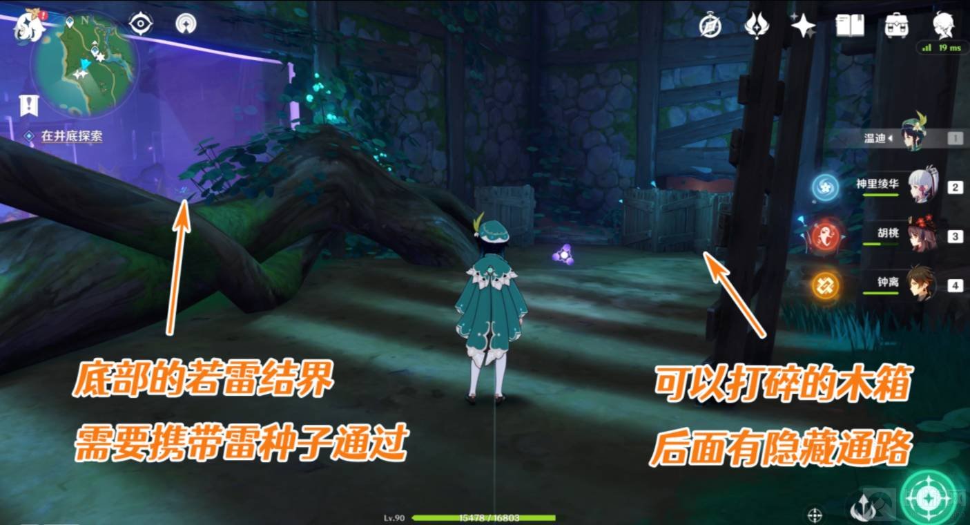 6.到达底部后,有一处若雷结界,需要携带雷种子才能通过(通道1),旁边的木箱子打碎后,还会出现一条通道(通道2),里面有收集物神秘的书页,以及一个雷神瞳。