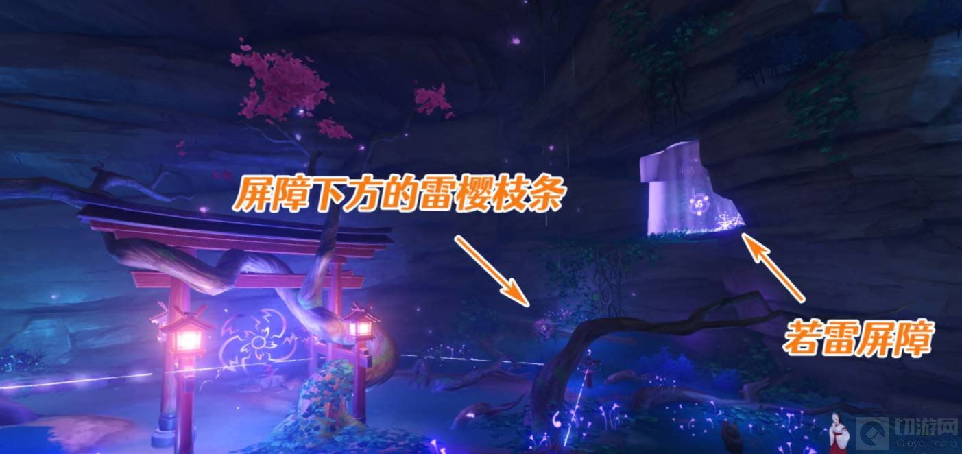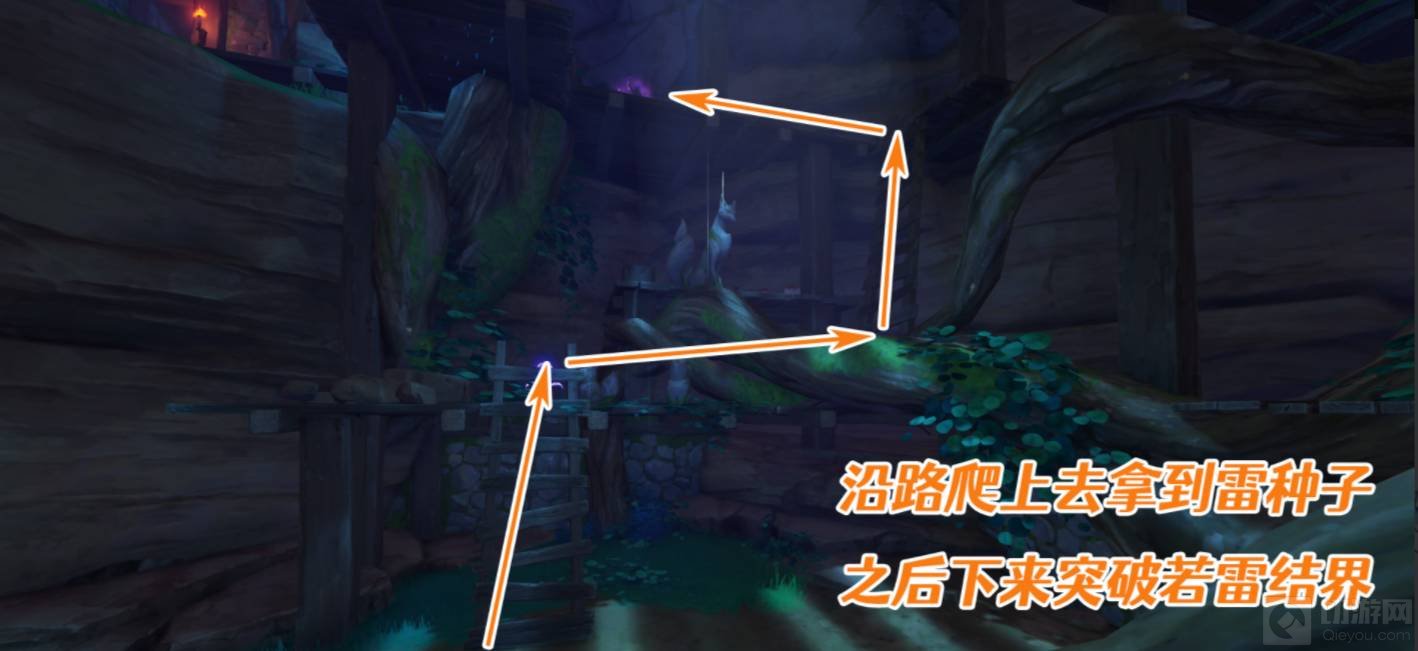 9.拿完拾取物后再回到进入通道前的底部空间,要想继续深入,进入通道1,就要突破底部的若雷结界,这时只需要爬到上面的雷樱枝条旁召唤雷种子后再下来进入屏障即可。