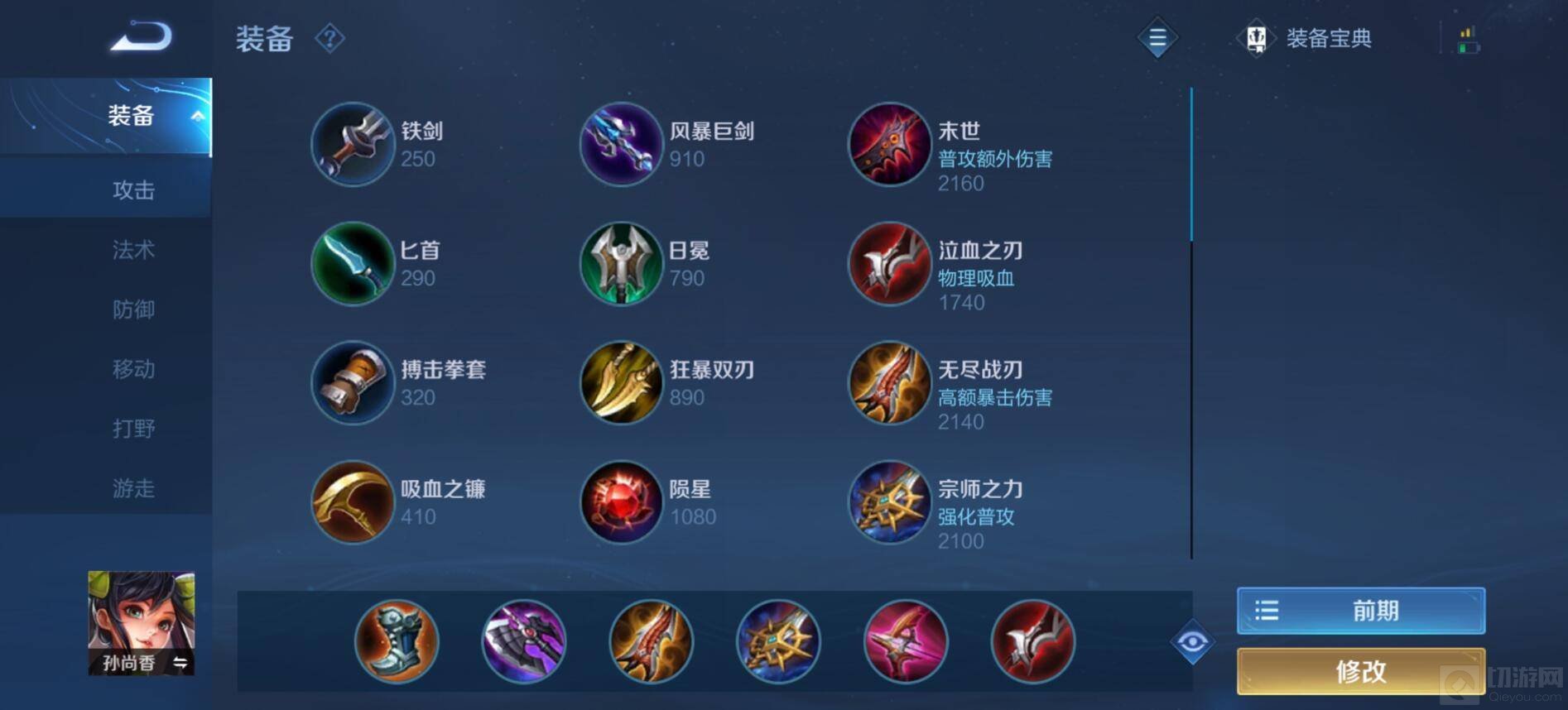 2,装备为攻速鞋,暗影战斧,无尽,宗师,破晓和泣血。后期可以把鞋子卖掉换复活甲名刀,追求极致输出的可以换成红叉。