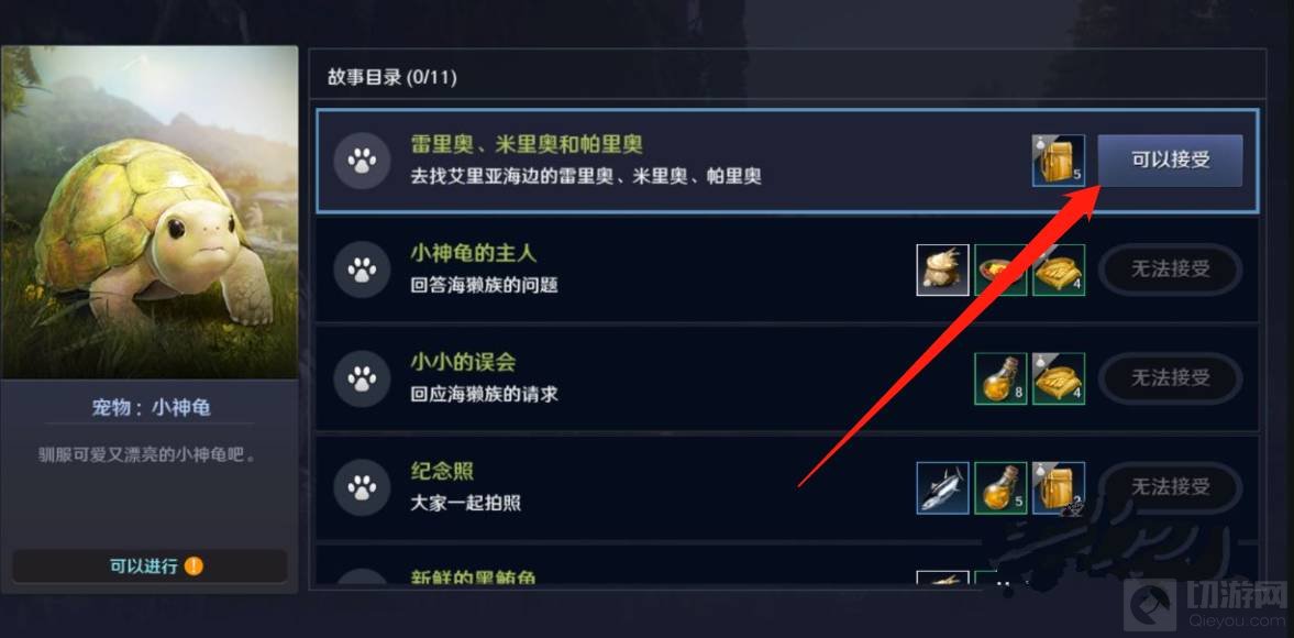 2、在海边钓鱼获得鱿鱼*2、石狗鱼*2、扁门鱼*2、东洋鲈*1并提交给小神龟后,即可开启故事任务。