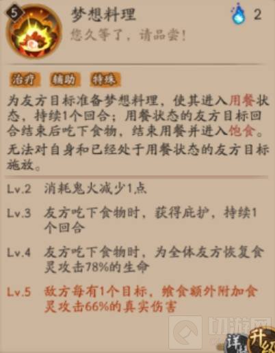 3、三技能【梦想料理】:使友方式神进入用餐状态,该式神回合结束后吃下食物进入饱食状态,满级后友方吃下食物将获得“庇护”效果,为全体友方恢复食灵攻击78%的生命。