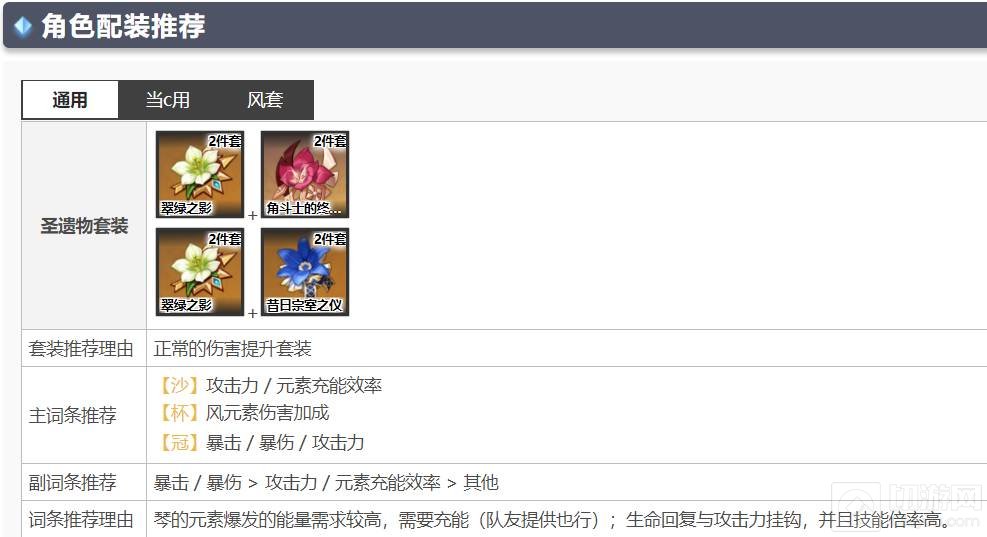 2、圣遗物主词条推荐【沙】攻击力 / 元素充能效率,【杯】风元素伤害加成,【冠】暴击 / 暴伤 / 攻击力。副词条推荐暴击 / 暴伤 >攻击力 / 元素充能效率 >其他。圣遗物词条推荐理由;琴的元素爆发的能量需求较高,需要充能(队友提供也行);生命回复与攻击力挂钩,并且技能倍率高。