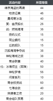 3.功能与活动。航海家只有达到指定解锁等级之后,才能使用对应功能,以及可以提供丰富奖励的限时活动和副本。活动所需的解锁等级如下表: