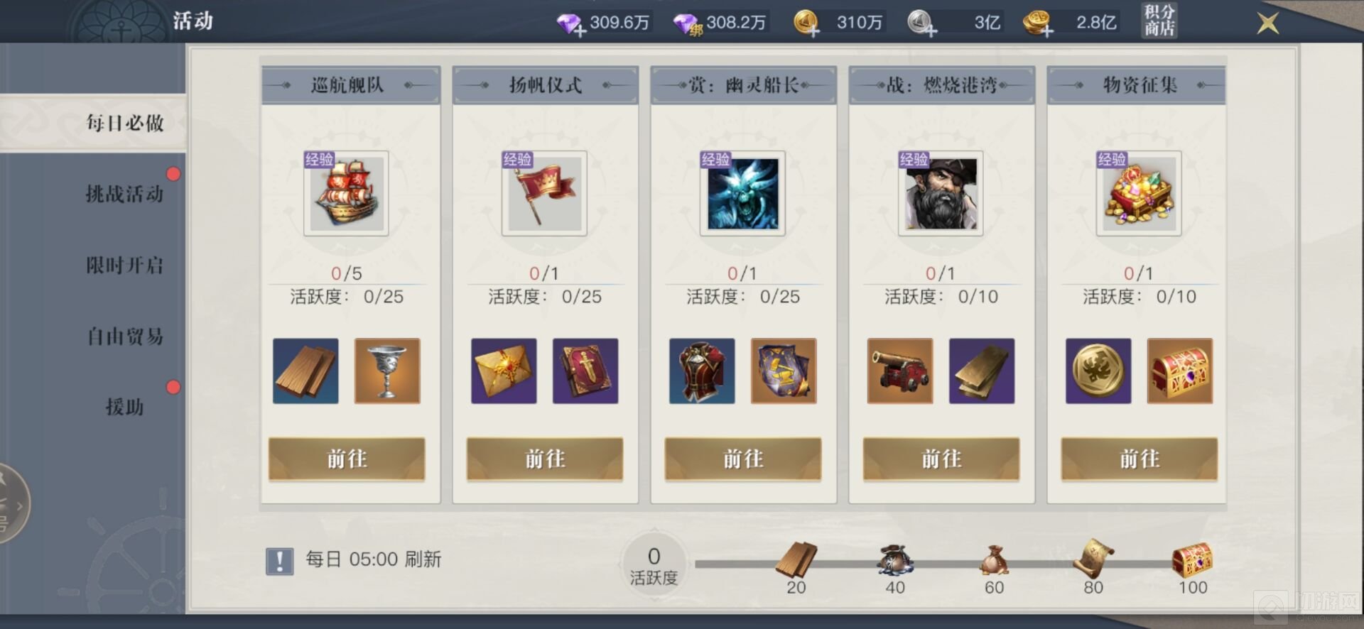 1.完成活动。黎明之海中获取经验值的主要方式还是完成活动类玩法,其中有一部分每日活动可以提供相当丰富的经验,具体包括:巡航舰队、同业委托、扬帆仪式、国家贸易、战:燃烧港湾、赏:幽灵船长、伐:冰海领主(困难)、维京海盗的再袭等等。具体活动可以前往主界面-活动进行查看。