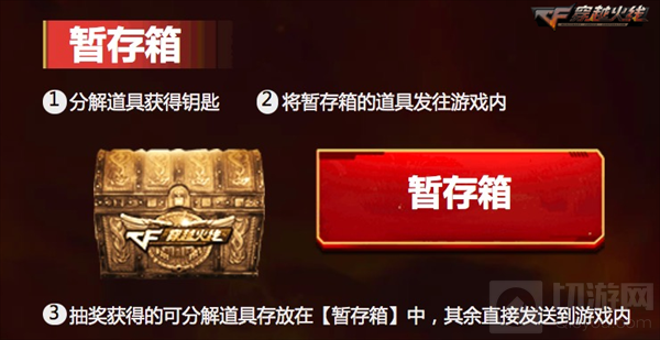 需要注意的是,抽奖获得的可分解道具将存放在【暂存箱】中,CFer可选择分解成钥匙或发往游戏仓库,已经领取到仓库的道具将无法退换。