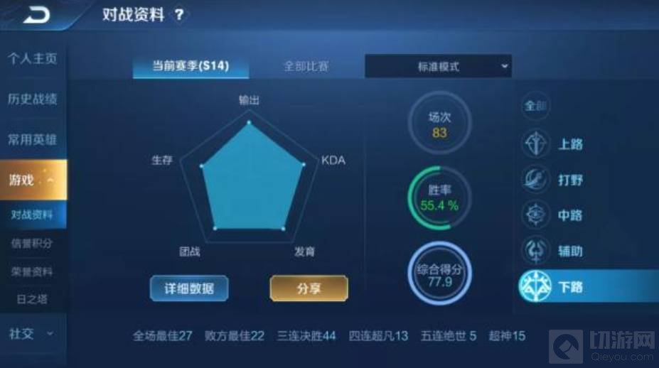 3、整场比赛的死亡次数(生存),死亡次数在KDA中占有很大的比重,尤其对射手和法师来说格外的重要。与之比较辅助就不会受死亡次数的太大影响。