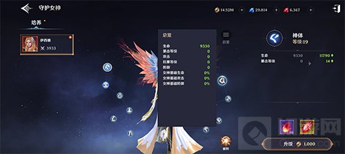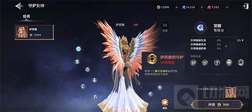 特殊节点:觉醒。升级消耗:金币、守护卷轴。属性提升:初始0级,最高30级,升级可提高女神属性并激活技能。提高的属性为女神基础生命/攻击/防御百分比。每升一级,三大属性会轮流提升3%。