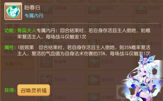 满层专属内丹下,当自身存活且主人倒地时,骨蕊夫人有70%概率复活倒地主人,为扭转战局提供强有力的助力。