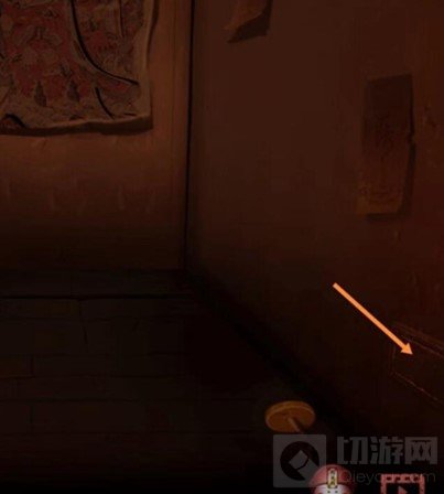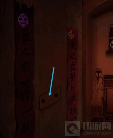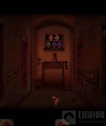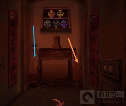 2、接着我们查看墙上的对联,获得洪福齐天,按照颜色顺序:蓝、绿、橙、紫,点击墙上面具,获得吊桥开关。