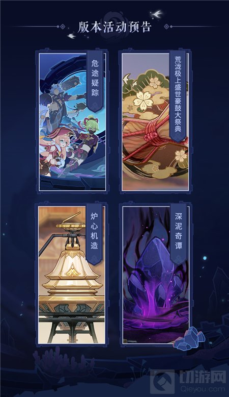 本次共有4个活动可以获取原石,版本主题活动「危途迷踪」活动场所在上版本新开的层岩巨渊,没开图的旅行者要抓紧时间哦,预计可得960原石,还能白嫖满精四星弓落霞;还有三个小活动分别是:荒泷极上盛世豪鼓大祭典(音游,可以获得新的乐器,活动中能DIY谱面去折磨好友)、炉心机造(收集材料的小活动),深泥奇谭,各可获得420原石。