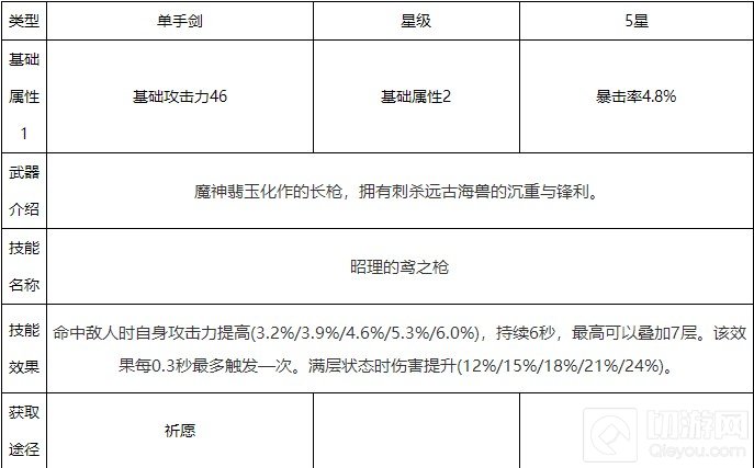 该武器的副属性满足了魁通过下落攻击输出需要的暴击率需求,武器技能也十分暴力的增加了较高的攻击力与全伤害加成,魈的攻击模式堆叠武器技能效果也十分容易。因此该武器可以说是当前版本魈的毕业武器。