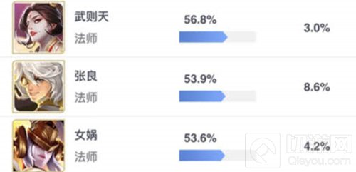 张良的胜率高达60.5%,在上场次数超过10次的法师英雄中排名第一。