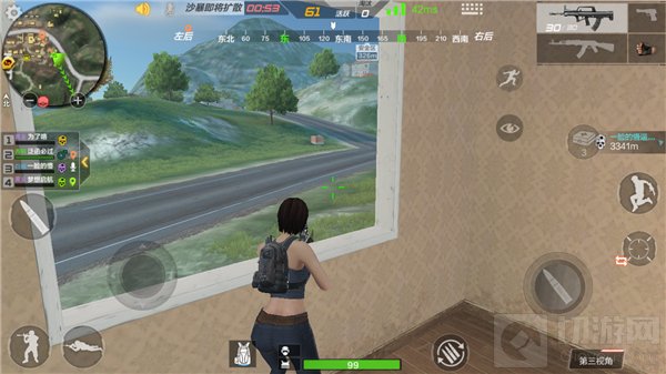 具体的防守地点如图2所示,在道路左侧建筑的二楼,我们能够清楚地观察到公路上的情况,另外我在这给大家介绍一个小技巧,那就是经过实际测试,可以清楚地了解到位于军事基地和北涌建筑群之间的载具多为敞篷式汽车,这样一来当我们在二楼进行伏击的时候,如果有敌人驾驶汽车出现,我们居高临下进行射击能够很轻松的淘汰敌人,而且我们可以看出,这栋建筑的窗口面积比较大,我们能够灵活地调整射击角度。防守效果很好。