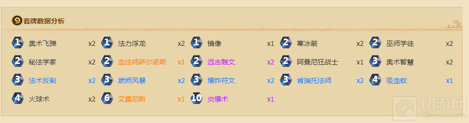 具有高度场合性,需要基于与其他的卡牌配合才能留下的卡包括:镜像/奥数智慧/爆炸符文/法术反制/远古雕文/燃烬风暴