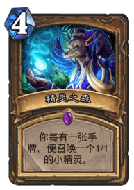 每有一张手牌,便召唤一个11小精灵,但是受到场面的限制,最多7只,对于这套德鲁伊来说,4费召唤4+的小精灵简直不要太简单,因为过牌的手段太充足了,随便抽到一张便可以顺利过渡到下一张过牌,玩了好多盘下来就没缺过牌。那么这一波小精灵有什么用呢?当然是配合咆哮啦,配合分岔路口也可以,总得来说对于我们咆哮德而言,有站场单位就有伤害,管他原始几攻呢。