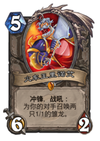 没有了树人之后,我们还是得找点东西替代,除了原本就有的利爪德之外(冲锋+咆哮+DK变脸=11点),我们能想到的只有火车王了,比利爪德多出2点伤害,DK形态下可以达到13点,虽说用作解场不能和树人相比,但是打脸的话效果已经很接近了,所以带一张用于增强斩杀能力。