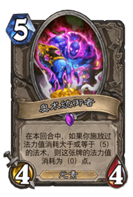 同样是比较黑科技的一张卡,这套牌的5费及以上法术有滋养、传播瘟疫、终极赖皮,共6张,且滋养和终极赖皮这两张过牌卡是可以过到0费奥术统御者的,我们也比较乐见这种形式,不然544在手上,总是在诱导你去打高费法术用它,总感觉怪怪的,带这张卡的作用也正是为了降低法术过牌那回合导致的场面空虚,而且有时候我们打终极赖皮会刚刚好10张,那么结果就是爆牌,而有了奥数统御者,不仅下了44站场,还解除了爆牌的危机,可谓一举多得。
