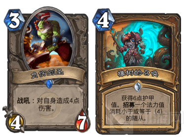 这个算是让笔者震惊的黑科技了,橡树的召唤可以拉出一个4费及以下的,原本大家习惯的配合是36铁木魔像,却忽略了剑圣这个完美的combo,4费加6点护甲,还拉出47站场,强的不要不要的,但如果只带2个剑圣,排序稍微出点问题橡树的召唤强度就降了很多,并且考虑到36嘲讽对快攻的抵抗能力,所以带一张36嘲讽,为橡树召唤多一个目标同时,加强对快攻的抵抗能力。