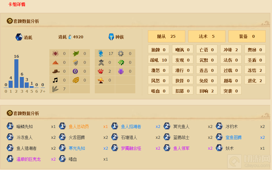 5、冰钓术带两张.一般4费左右用,补充手牌,加快任务的进程,让节奏更顺滑,算是一个润滑剂,整体曲线低,可以带两张。冰冻鱼人又是一个抢节奏的神卡2费上让场面交换的主动权掌握在自己手里,奠定场面优势,是个优质的节奏卡。