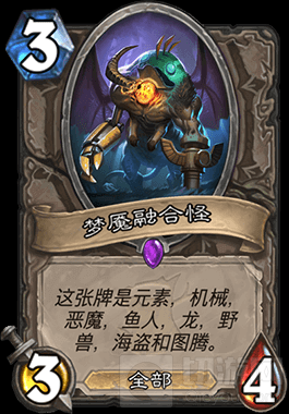 2、开始带了两张332鱼人斥候者,后调整为334梦魇融合怪,因为在对抗恶毒德鲁这个卡组334的身材能打过德鲁伊3费级之前的一切生物,哪怕4费的撒隆苦囚也能一挑2,只要场面站住了,让任务做完,胜利只是探囊取物,而332的发现鱼人貌似能让任务做得更快,但实测下来一般任务在6-7费就能做完,平均6.5费,也就是说332发现鱼人对任务完成快慢的影响因素很低,且该卡组曲线顺滑,每回合都可以上生物,不会出现卡手的情况,所以不用担心任务做得慢和节奏断了的情况,权衡之使用身材更好的融合怪。