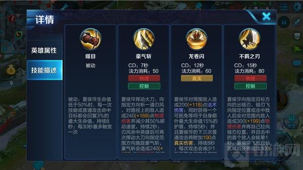 一技能-豪气斩:夏侯惇挥动大刀,向指定方向斩一道刃风,对路径上的敌人造成物理伤害并减少其移动速度;刃风命中英雄后可再次挥动大刀向指定范围方向释放豪气斩,豪气斩会造成物理伤害并将范围内敌人击飞。