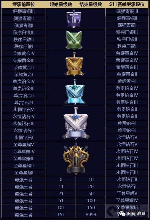 新赛季除了版本更新之外,还有当前段位继承机制,根据目前得到的情报,S11赛季的继承机制跟S10赛季保持一致。最强王者20星以内将继承至钻石段位,而黄金四以下段位继承后段位保持不变。