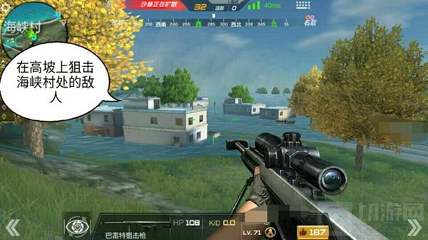 在海峡村附近有一处坡,小伙伴们可以选择在此处来打击海峡村的敌人。因为敌方一般都会隐蔽在房间内部,所以在这上面利用狙击枪精准的打击是一个比较好的选择。首先点位尽量的选择高坡处的树木背后,利用树木的两侧来狙击海峡村处的敌人。狙击的时候可以先打上持续恢复药剂来保证自己的状态,一旦敌人显出身形直接瞄准其头部将其淘汰。如果敌人据守房屋不出,组队模式可以让队友走出隐蔽物,在山坡上来回的走动,等到敌人出来打击我们队友的时候再其狙击淘汰。