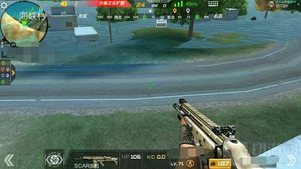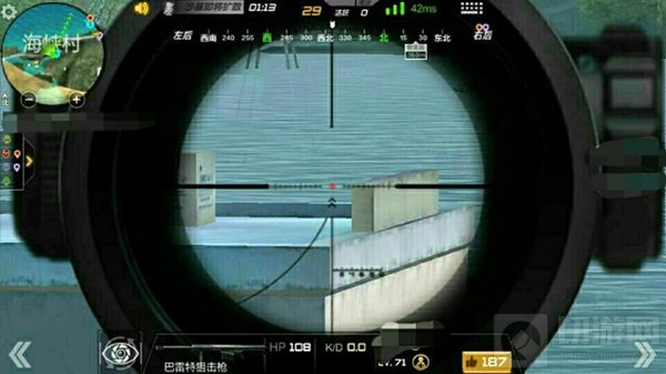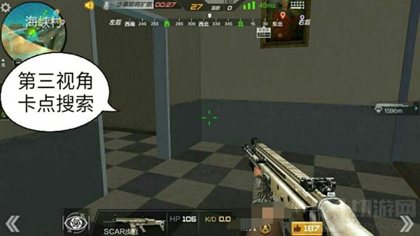 海峡村是由马路分隔开的两侧建筑群,有时对面也会有敌人出没。小伙伴们可以利用楼顶的平台来打击对侧的敌人。在楼顶平台上有几个木箱子,我们可以半蹲在木箱后面利用木箱的两边来打击敌人。木箱会为我们提供隐蔽,在三楼平台也有着较好的视野,看到敌人直接狙击将其淘汰。