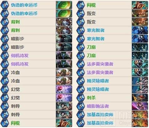 我们起手找背刺、刺骨、幻觉,手牌好的话可以留法多雷突袭者。对上快攻卡组时要留叛变、刀扇;对上控场卡组时则应该留精灵咏唱者,闷棍和寒光智者也可以留。
